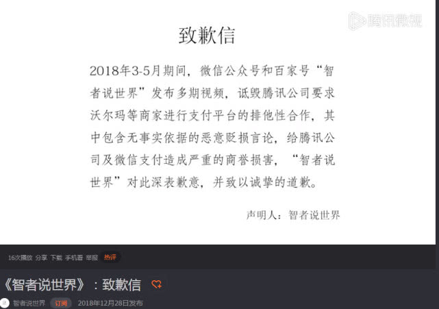 一自媒体号“智者说世界”,于昨日在腾讯视频发布了一封致歉信,向腾讯和微信支付道歉。