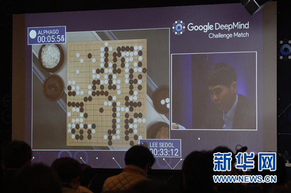3月9日,直播间的屏幕显示,李世石在对弈中明显落后。当日,在韩国首尔举行的围棋人机大战首场比赛中,人工智能“阿尔法围棋”战胜韩国九段棋手李世石。 新华社记者姚琪琳摄