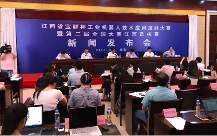 打造高水平比赛,选拔高技能人才,7月18日由江西省政府新闻办、省工信委共同主办,由江西宝群电子科技有限公司冠名的,江西省第二届“宝群杯”工业机器人技术应用技能大赛新闻发布会在江西省政府新闻办新闻发布厅顺利召开。发布会由省工业和信息化委员会副巡视员王江南发布,省政府新闻办新闻发布处处长陈惠龙主持,江西省人社厅副巡视员张维明、叶宝凌,省总工会副主席吴海平,共青团江西省委副书记廖良生等主要领导以及三十多家社会主流媒体共同出席了本次发布会。